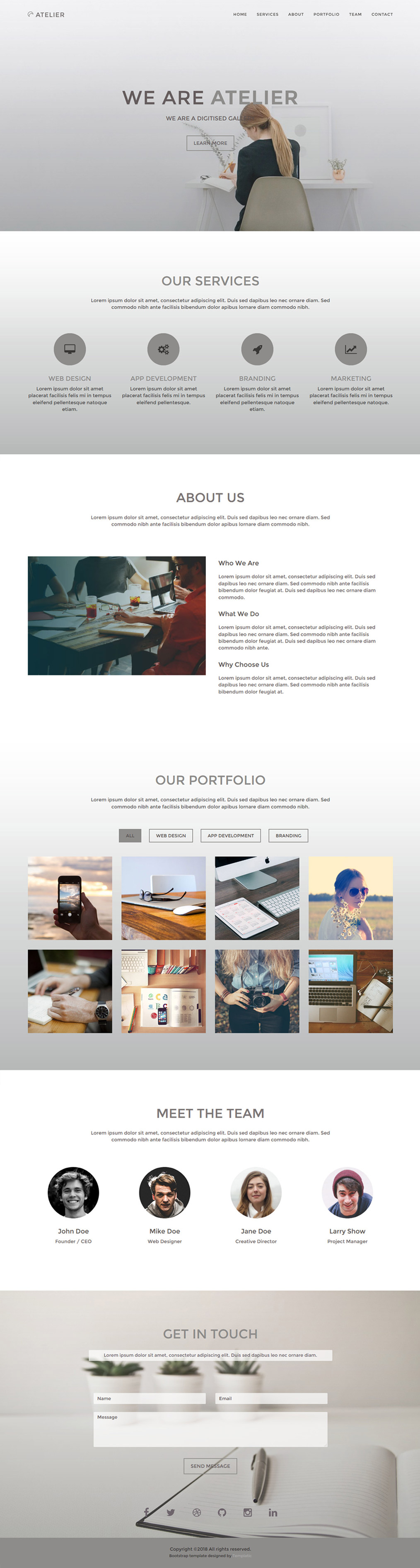 This is a freeHTML5 One page Multipurpose bootstrap template. It is built using the Bootstrap and it can be used for the agency, corporate, small business, or freelancer websites. It is perfectly responsive and contains many sections like Services, About, Stats, Gallery, Contact, and Testimonials.