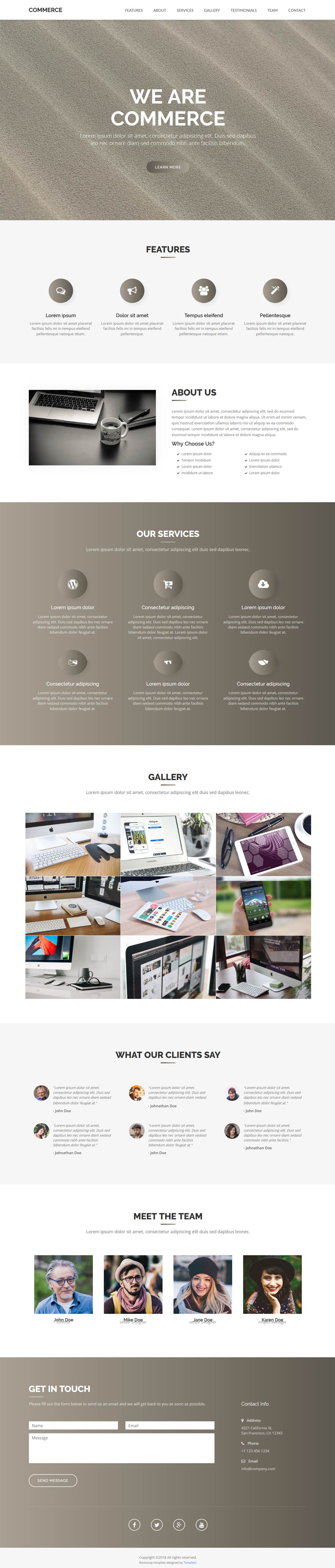 Commerce is a feature rich and multipurpose bootstrap template for you to get started with your website. The full screen image header is designed to impress. Besides, the sticky header assures easy navigation. Moreover, it comes with various website sections to describe different aspects of your business.